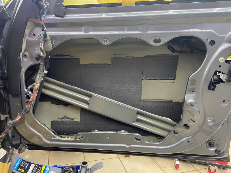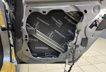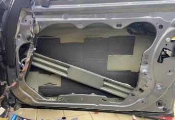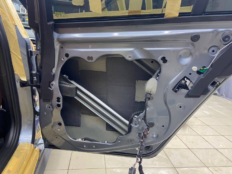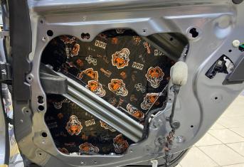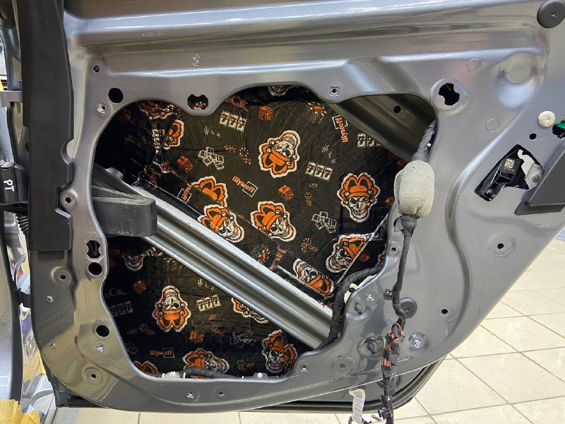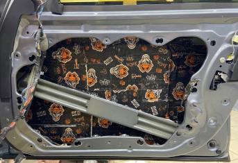 Третьим слоем применяем виброизоляцию Шумофф Jack на внутреннюю стенку двери. Проводку частично обрабатываем Шумофф Specific. Саму обшивку двери оклеиваем виброизоляцией Шумофф Jack и полностью закрываем шумопоглощающим материалом Шумофф Герметон А15. Обратите внимание, как тщательно мы обрабатываем двери виброизоляцией и шумопоглотителем - мы не экономим материал и щедро укладываем его в необходимые места. По канту обшивки двери и клипсы укладываем Шумофф Absorber 5, чтобы избежать раздражительных звуков и не портить ЛКП.
