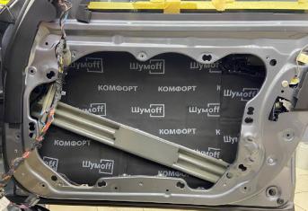 Первым слоем идёт виброизоляция Шумофф Black Jack. Затем уложили шумо-теплоизоляцию Шумофф Комфорт 3 для сохранения комфортной температуры внутри авто. Третий и финальный слой Шумофф Absorber А15. Материал плотно прикатывается валиком по ровной плоскости, исключая усилители и попадание воздуха.