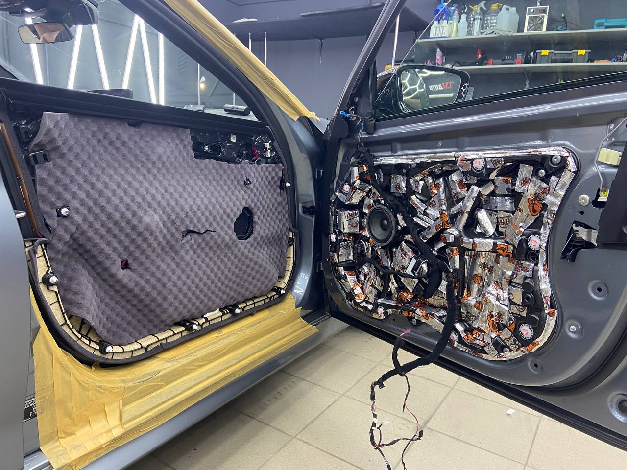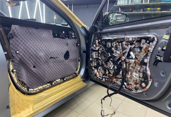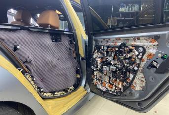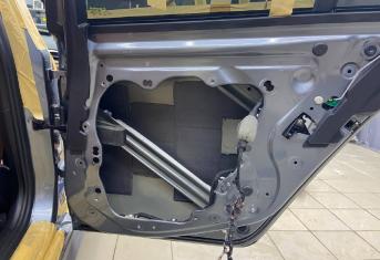 Начинаем работу с разборки дверей, подготовки поверхности и обезжириванию. Все работы по демонтажу пластика выполняются специальным инструментом. Мы гарантируем целостность клипс, креплений и отсутствие различного рода царапин, задиров на обшивках.