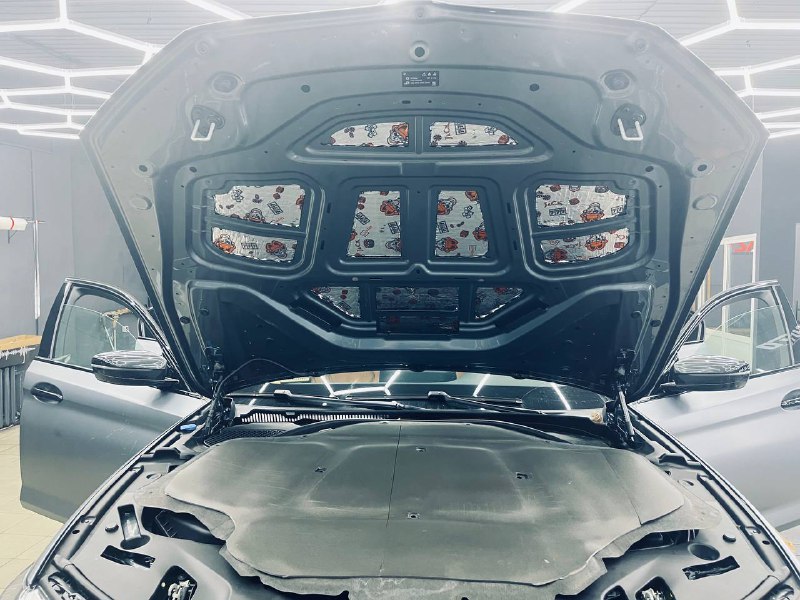 При заказе комплексной шумоизоляции автомобиля - обработка капота в подарок! На внешний металл крышки капота наносим виброизоляцию ШумоФФ Jack, на штатную обивку капота монтируем шумотеплоизолятор Шумофф П4.
