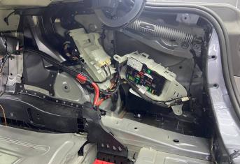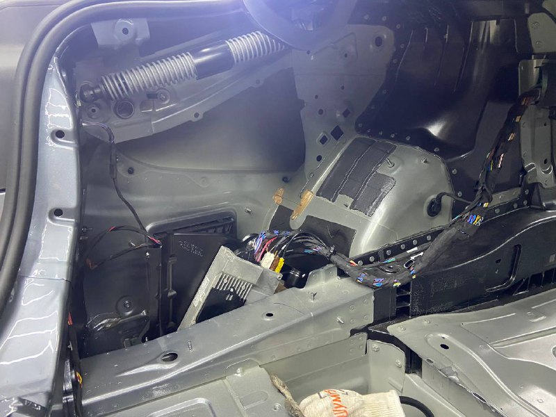 Штатная шумоизоляция в BMW 5 уложена выборочно. Напыления вибродемпфера есть на полу салона и багажника, дверях. Весь комфорт производитель достигает за счёт сложного каркаса и качественных отделочных материалов в интерьере. Ниже вы можете увидеть фотографии после полного разбора. Перед началом работ, мы в обязательном порядке проверяем заводскую шумоизоляцию на качество укладки. Плохо проклеенные участки демонтируем. После обезжириваем все поверхности и приступаем к монтажу.