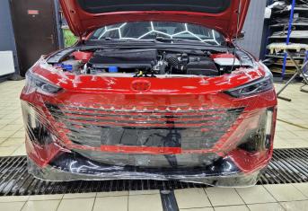 В работе применяем полиуретановую пленку NAR, толщиной 190 микрон. Эта пленка обладает функцией самовосстановления небольших царапин при высокой температуре. Клиент выбрал для своего автомобиля пакет Трасса, что подразумевает оклейку передней части кузова и оптики.