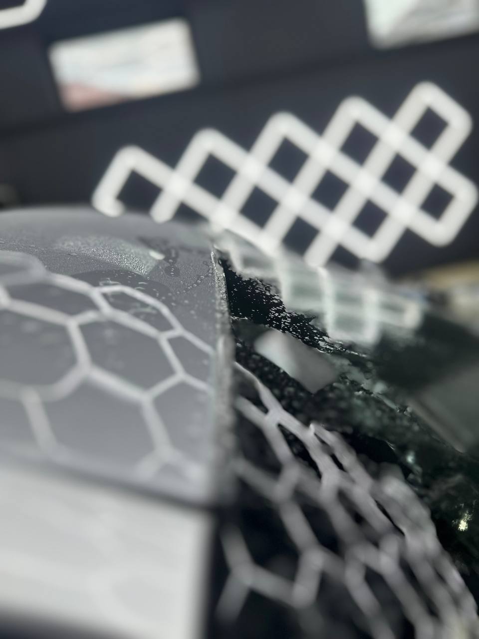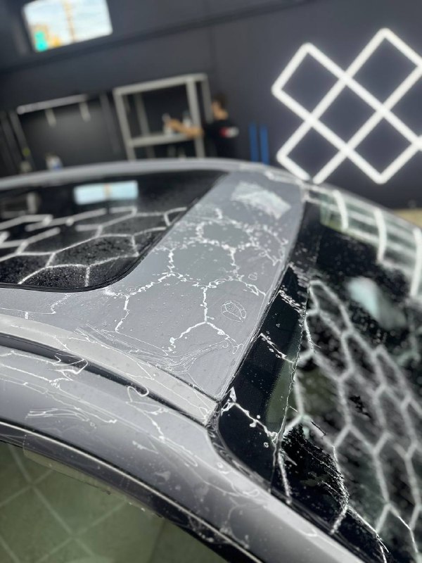 Далее не о процессе, а о конечном результате который получается на данном авто. Автомобиль будет меньше пачкаться, пленка обладает высоким гидрофобным эффектом и грязь не будет задерживаться на кузове. Ну и самое главное это защита, каждый оклеенный элемент выполнен с подворотом пленки по периметру. Сколы и царапины больше не угрожают оклеенным кузовным элементам данного автомобиля, и если вдруг произойдет неприятная ситуация с мелким ДТП к примеру во дворе, с большей долей вероятности этот вопрос решиться заменой пленки на отдельном элементе. Так же автомобиль обрел на долго гарантированный блеск, так как пленка имеет самозаживляющий эффект и мелкие риски и царапинки будут затягиваться под воздействием температуры.